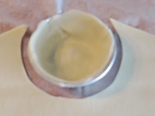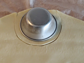 Colocar a forma em cima da massa folhada e cortar um pouco maior