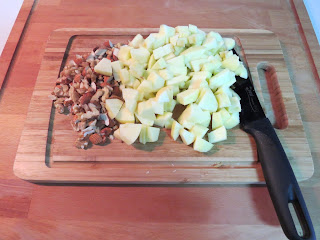 Descasque as maças e corte as maças em cubinhos pequeninos,