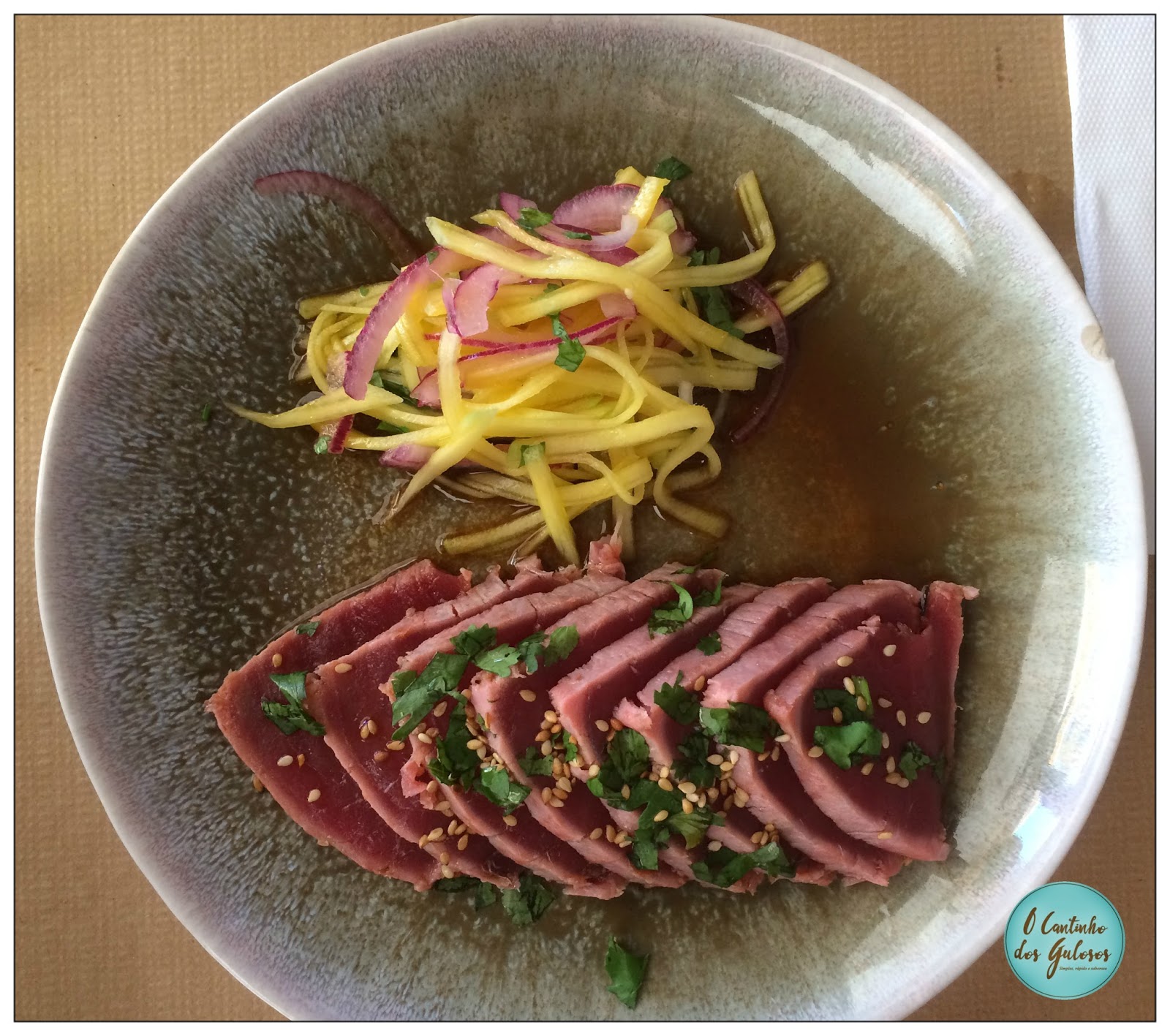 de atum recomendo a 100% é servido com um ceviche de manga e umas lascas de
