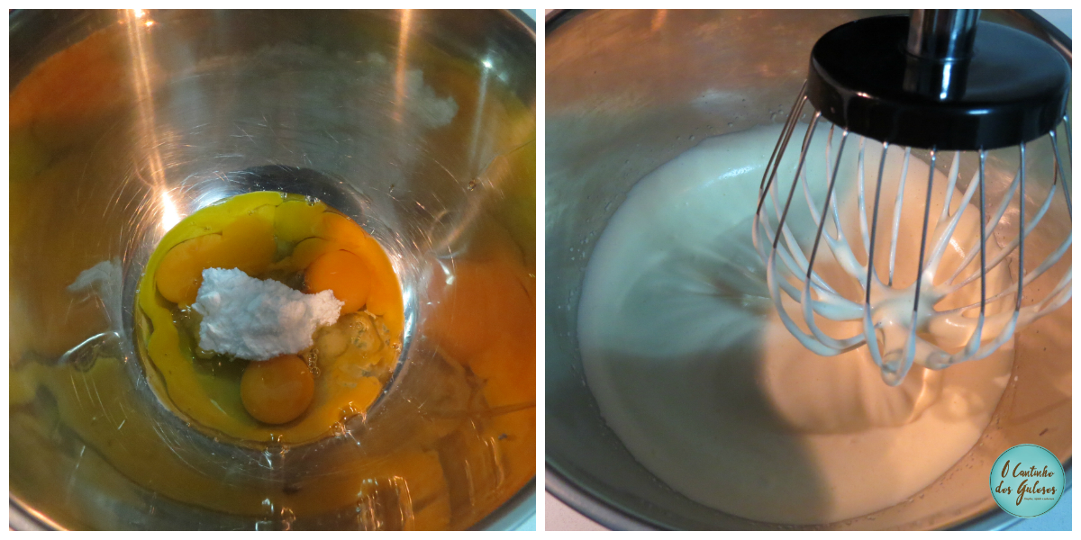 Numa tigela bata bem as gemas, os ovos e o açúcar em pó até ficar